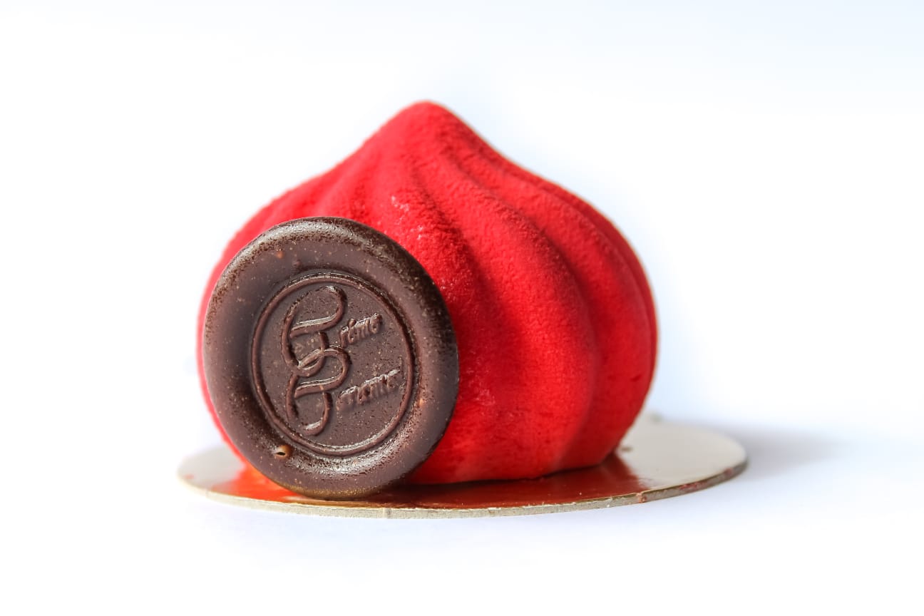 Mousse de chocolate 55% relleno de gelee de frutos rojos y un biscocho de chocolate.